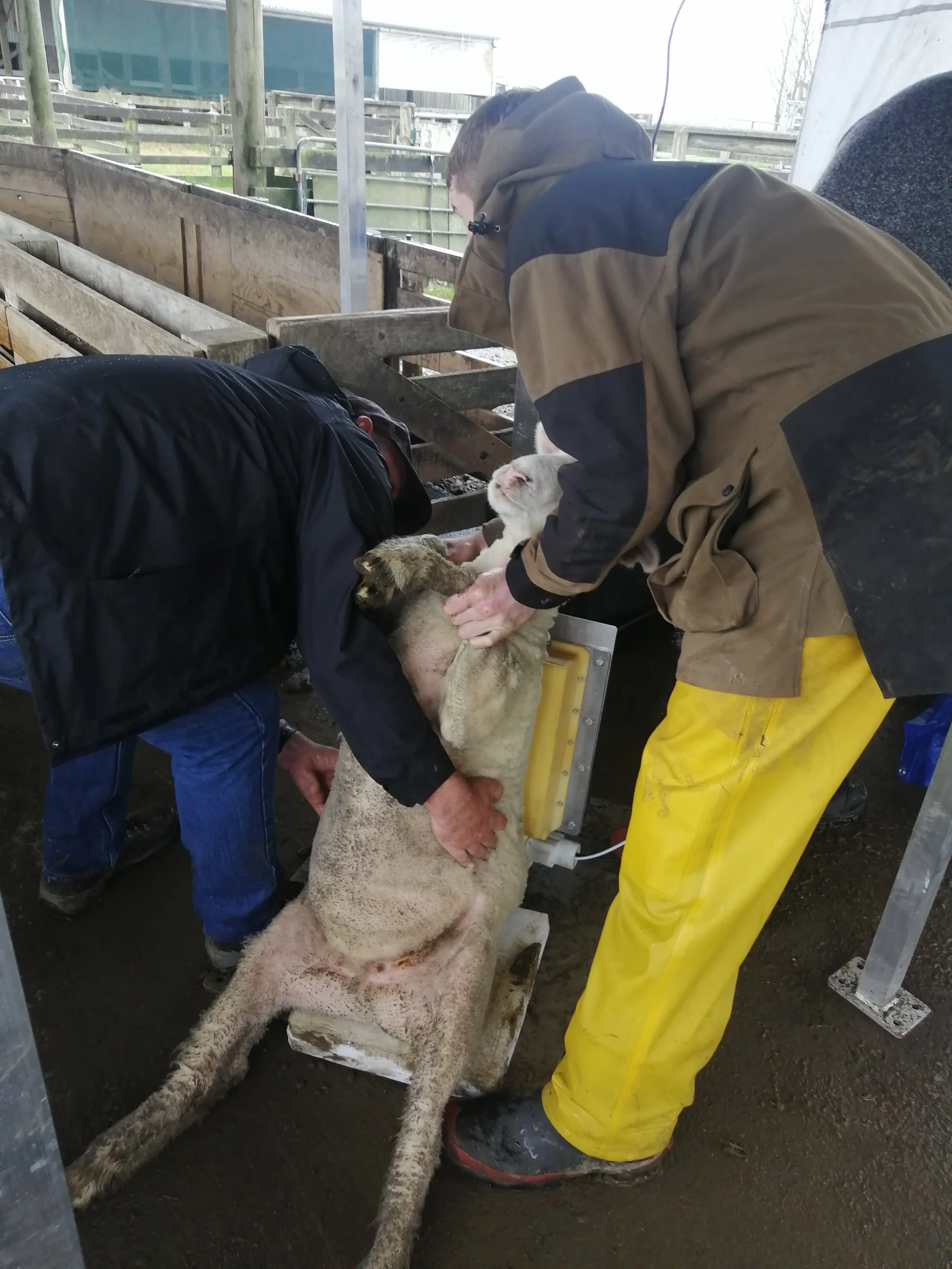 Here's our "shearer-style" setup - before and in use. A big focus on animal handling with a bit of effort being required to position the animal to align the sensor on the backstrap - but achievable.